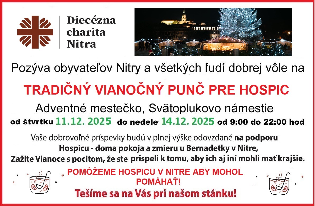Od 11. decembra do nedele 14. decembra 2025 sa bude podávať v Adventnom mestečku na Svätoplukovom námestí tradičný Maltézsky punč za dobrovoľný príspevok. Výťažok zo zbierky bude v plnej výške odovzdaný pre diecézny Hospic u Bernadetky v Nitre a ďalšie charitatívne aktivity pre chudobných, chorých a trpiacich.