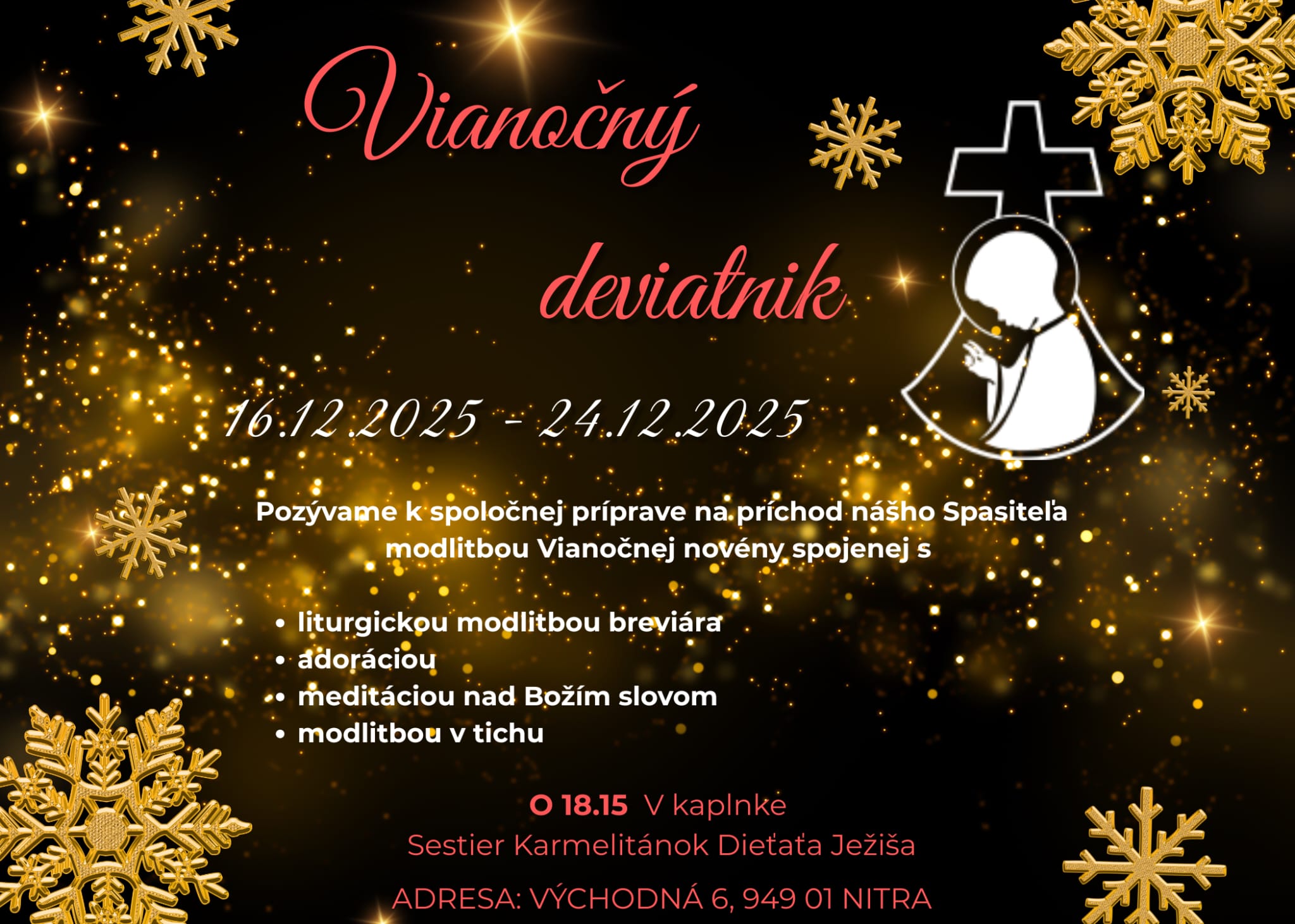 Sestry karmelitánky Dieťaťa Ježiša všetkých srdečne pozývajú na hlbšiu prípravu na Božie narodenie spoločnou modlitbou Vianočnej novény. Budeme sa ju modliť od 16. decembra nasledujúcich deväť dní (okrem Štedrého dňa) o 18:15 v kaplnke sestier karmelitánok pod hradom. Adresu a bližšie informácie nájdete na výveske v predsieni kostola. Tešíme sa na spoločnú prípravu na Príchod Krista do našich životov.
